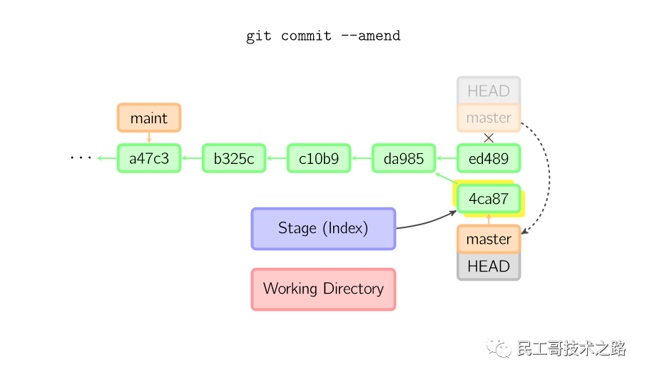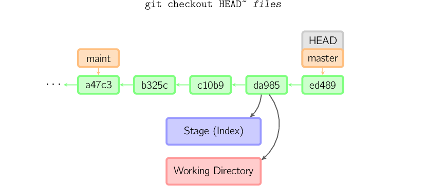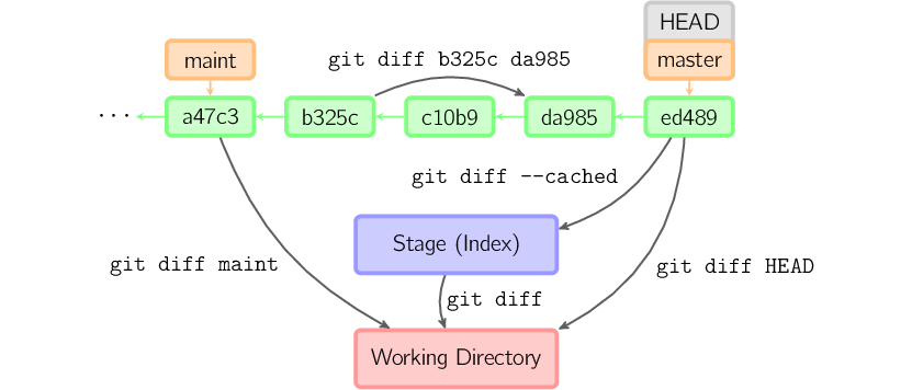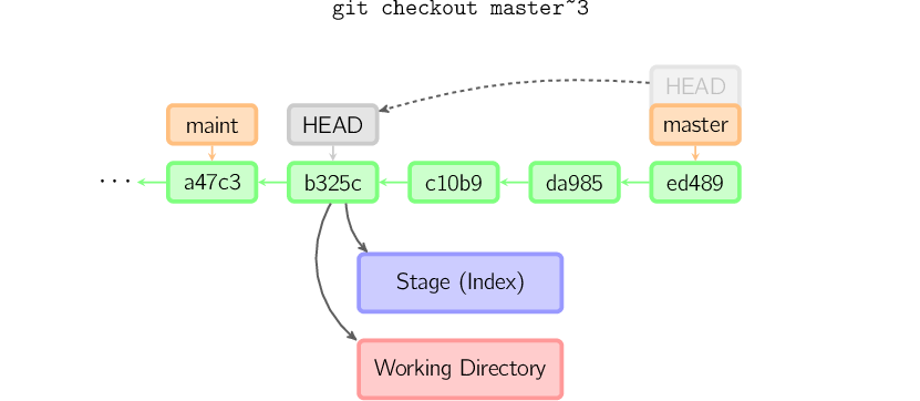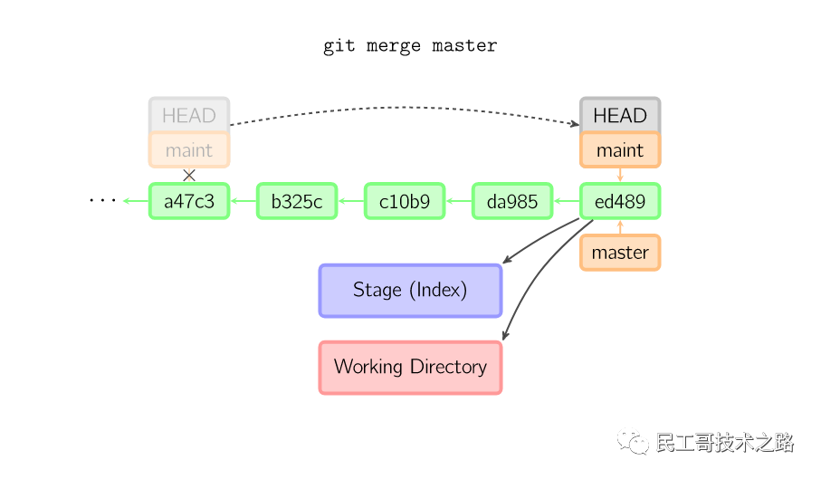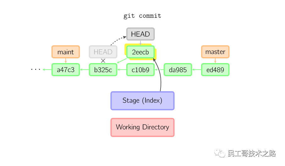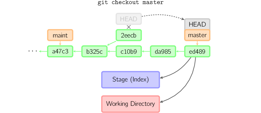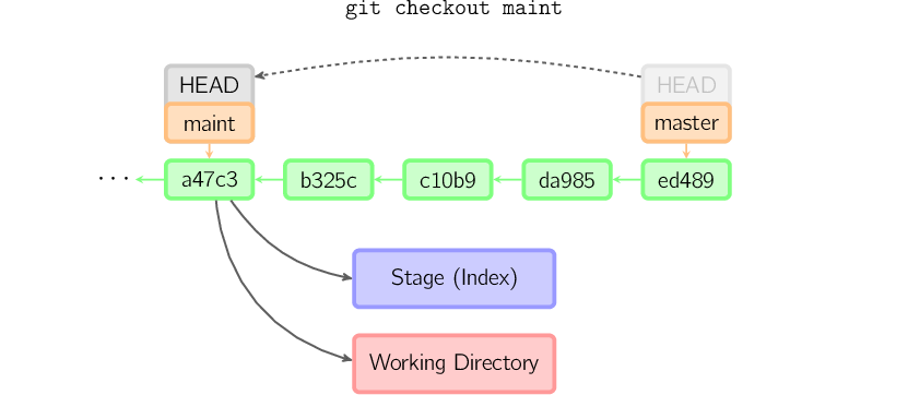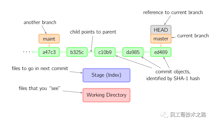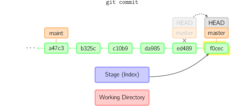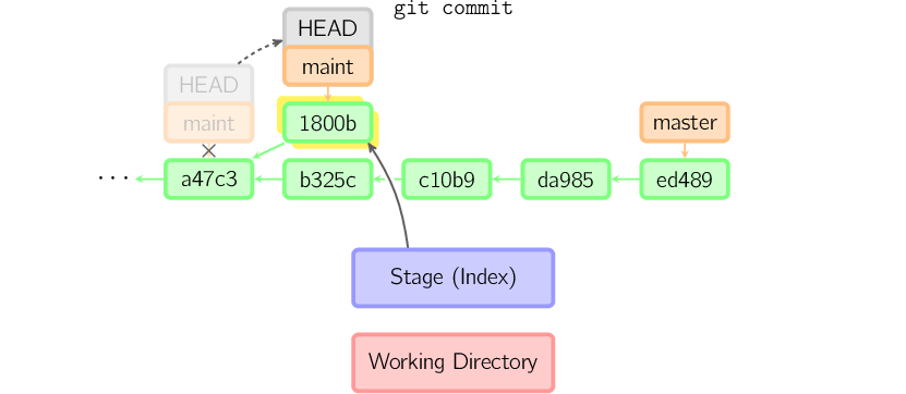 绿色的5位字符表示提交的ID,分别指向父节点。分支用橘色显示,分别指向特定的提交。当前分支由附在其上的HEAD标识。这张图片里显示最后5次提交,ed489是最新提交。master分支指向此次提交,另一个maint分支指向祖父提交节点。