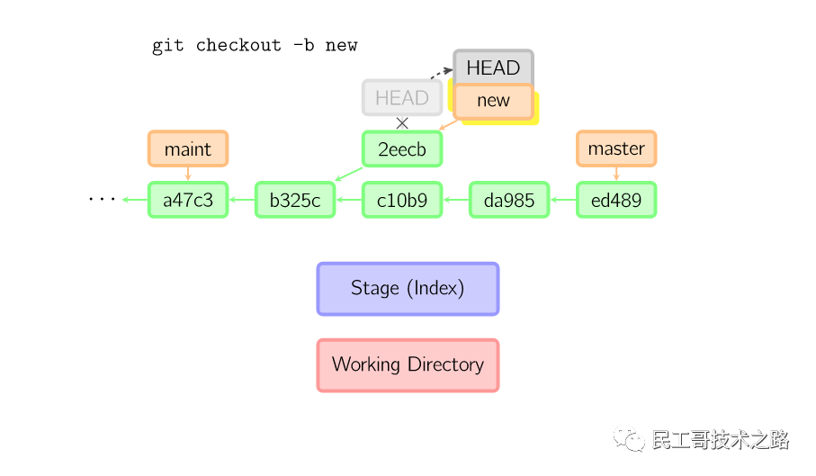 一旦此后你切换到别的分支,比如说master,那么这个提交节点(可能)再也不会被引用到,然后就会被丢弃掉了。注意这个命令之后就不会有东西引用2eecb。