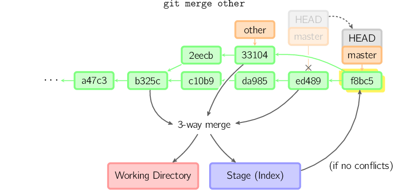 Merge命令把不同分支合并起来。合并前,索引必须和当前提交相同。如果另一个分支是当前提交的祖父节点,那么合并命令将什么也不做。另一种情况是如果当前提交是另一个分支的祖父节点,就导致fast-forward合并。指向只是简单的移动,并生成一个新的提交。