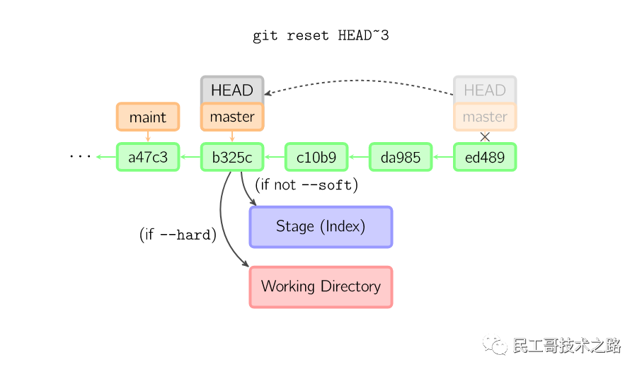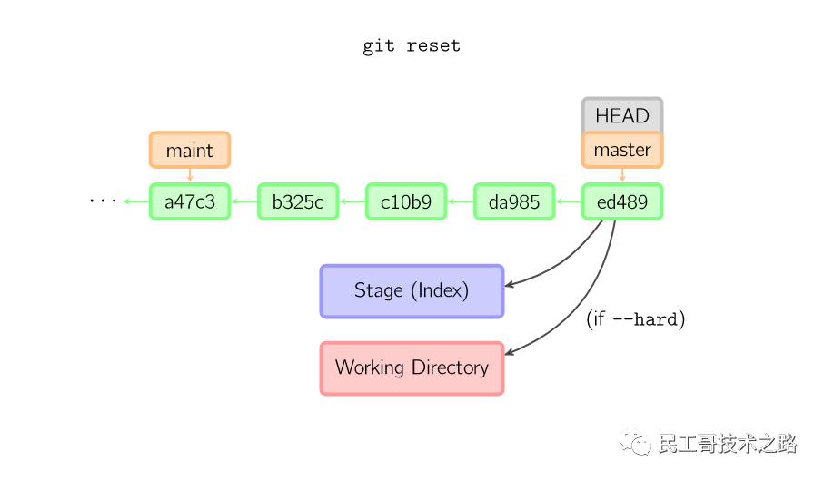 如果没有给出提交点的版本号,那么默认用HEAD。这样,分支指向不变,但是索引会回滚到最后一次提交,如果用–hard选项,工作目录也同样。