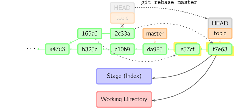 上面的命令都在topic分支中进行,而不是master分支,在master分支上重演,并且把分支指向新的节点。注意旧提交没有被引用,将被回收。