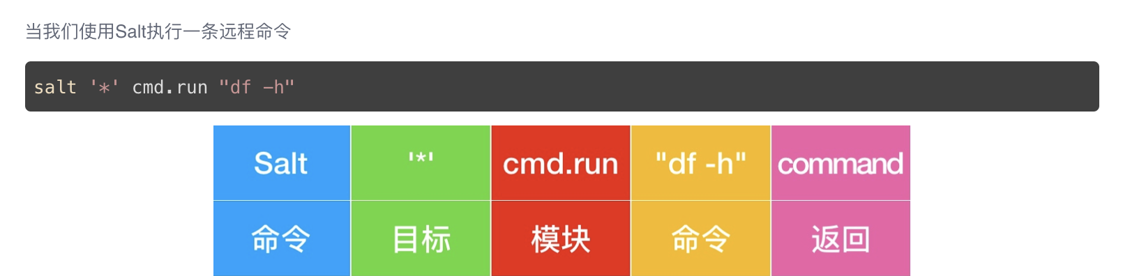 1 2 3 4 [root@master 192.168.199.155 ~]$salt --help Usage: salt [options] '<target>' <function> [arguments] # salt命令 参数 目标 salt模块的函数 远程执行的参数