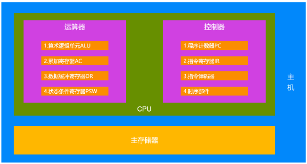 - 运算器:算术逻辑单元ALU 、累加寄存器AC、数据缓冲寄存器DR、状态条件寄存器PSW;