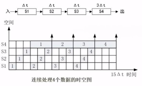 注:t1,t2,……tk表示一条指令每一段执行的时间(如上图取指时间,分析时间,执行时间);n表示执行了多少条指令;$△t$表示流水线周期时间(即指令执行时间最长的一段);k表示该条指令执行分成了几段
