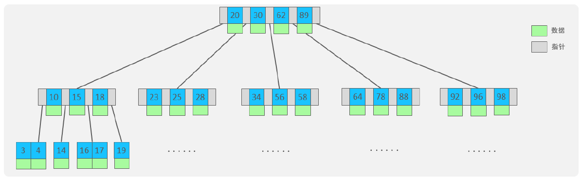 - 在B树中,非叶子节点和叶子节点都会存放数据。