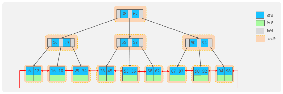 MySQL索引数据结构对经典的B+Tree进行了优化。在原B+Tree的基础上,增加一个指向相邻叶子节点的链表指针,就形成了带有顺序指针的B+Tree,提高区间访问的性能,利于排序。