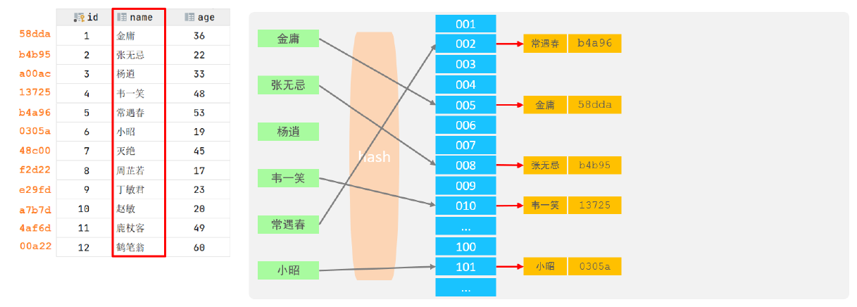 Hash索引 | 底层数据结构是用哈希表实现的, 只有精确匹配索引列的查询才有效, 不支持范围查询 |