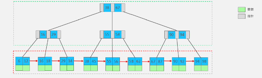 - 红色框框起来的部分,是数据存储部分,在其叶子节点中要存储具体的数据。