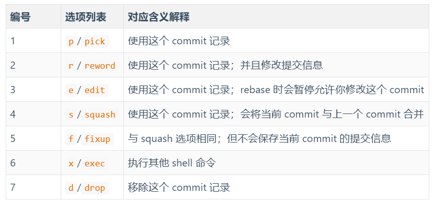 | # 调整最近五次的提交记录 $ git rebase -i HEAD~5 $ git rebase -i 5af4zd35 # 往前第六次的commit值 reword c2aeb6e 3rd commit squash 25a3122 4th commit pick 5d36f1d 5th commit fixup bd5d32f 6th commit drop 581e96d 7th commit