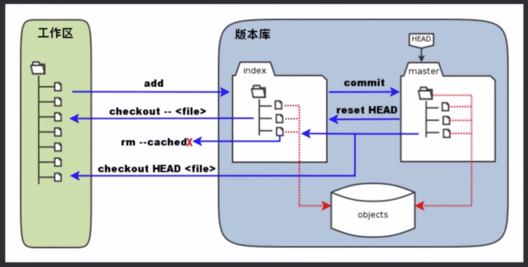 | # 工作区 -> 暂存区$ git add <file/dir># 暂存区 -> 本地仓库$ git commit -m "some info"# 本地仓库 -> 远程仓库$ git push origin master # 本地master分支推送到远程origin仓库 # 工作区 <- 暂存区 $ git checkout -- <file> # 暂存区文件内容覆盖工作区文件内容