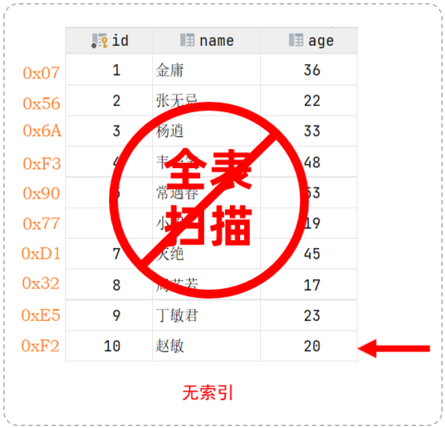 在无索引情况下,就需要从第一行开始扫描,一直扫描到最后一行,我们称之为 全表扫描,性能很低。