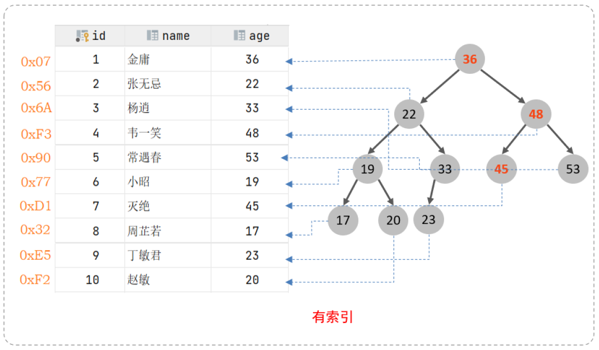 如果针对于这张表建立了索引,假设索引结构就是二叉树,那么也就意味着,会对age这个字段建立一个二叉树的索引结构。