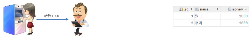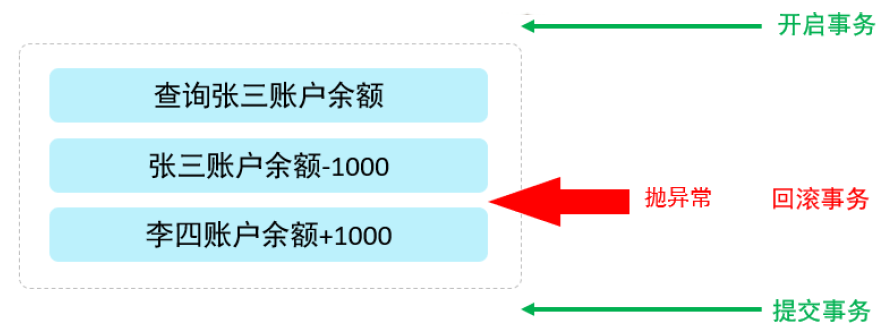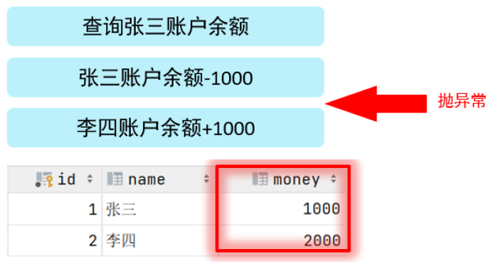 异常情况: 转账这个操作, 也是分为以下这么三步来完成 , 在执行第三步是报错了, 这样就导致张三减少1000块钱, 而李四的金额没变, 这样就造成了数据的不一致, 就出现问题了。
