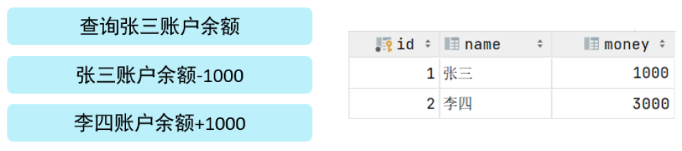 正常情况: 转账这个操作, 需要分为以下这么三步来完成 , 三步完成之后, 张三减少1000, 而李四增加1000, 转账成功 :