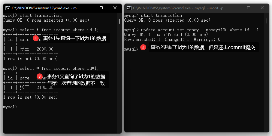 - 当事务2还未commit的时候事务1又去查询了id为1的记录,发现张三余额变为了2100