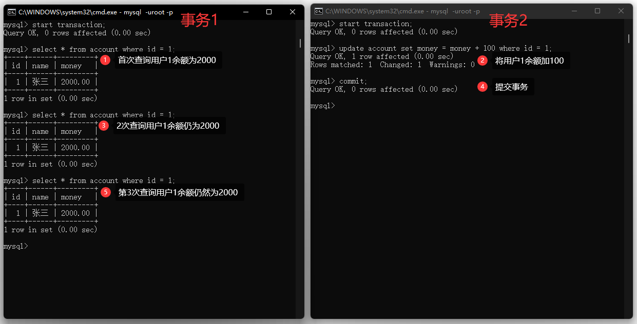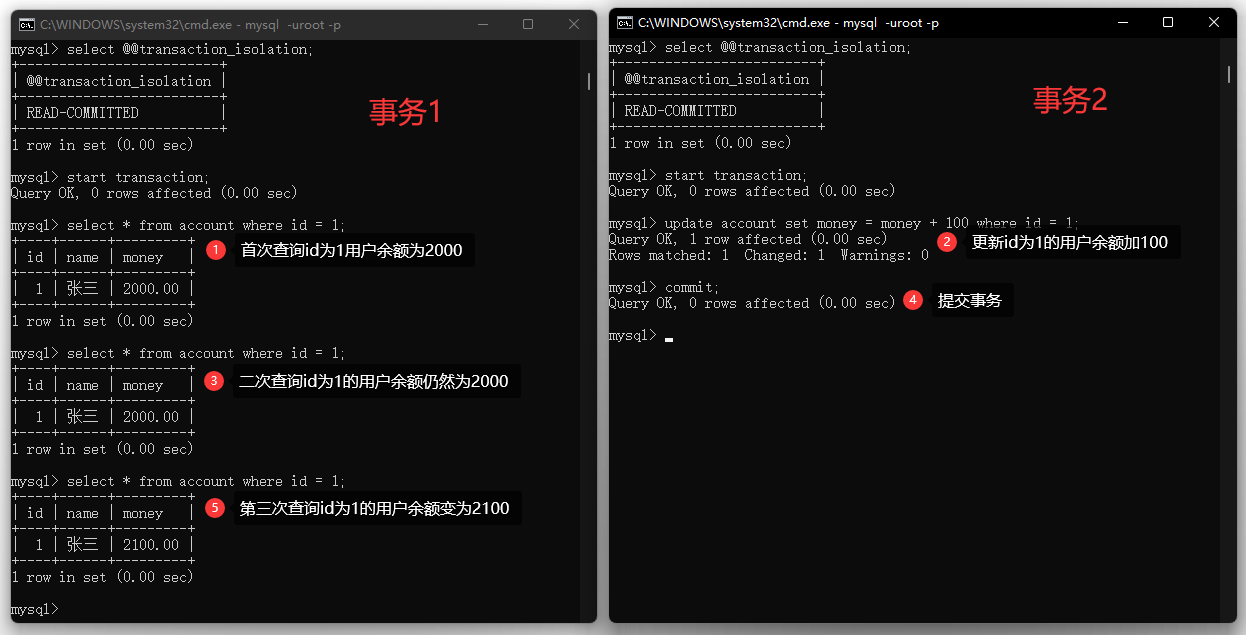 - 最后事务1又查询了一次id为1的用户余额,发现余额变为2100;