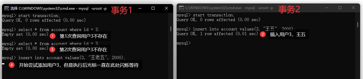 - 事务1决定添加用户3,执行光标停在此处等待;