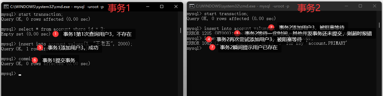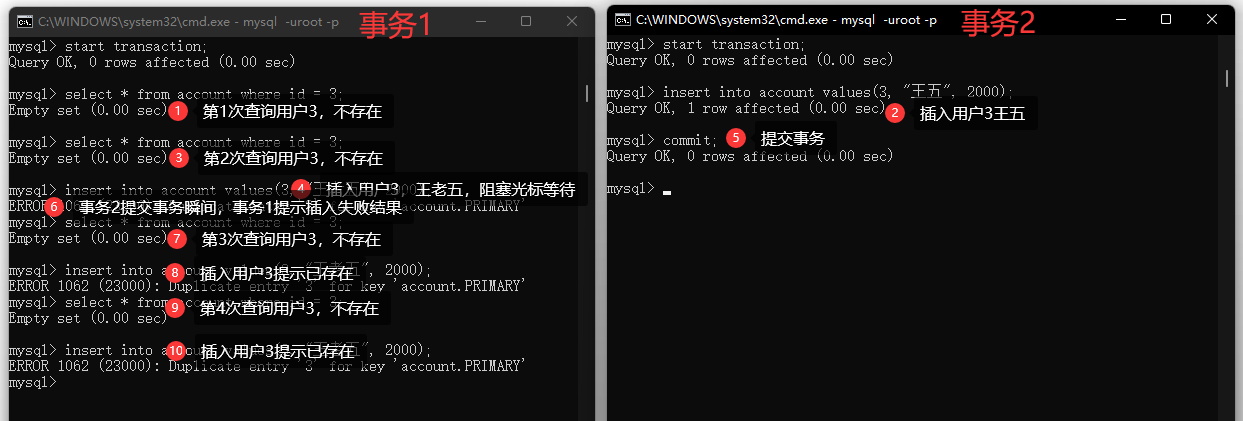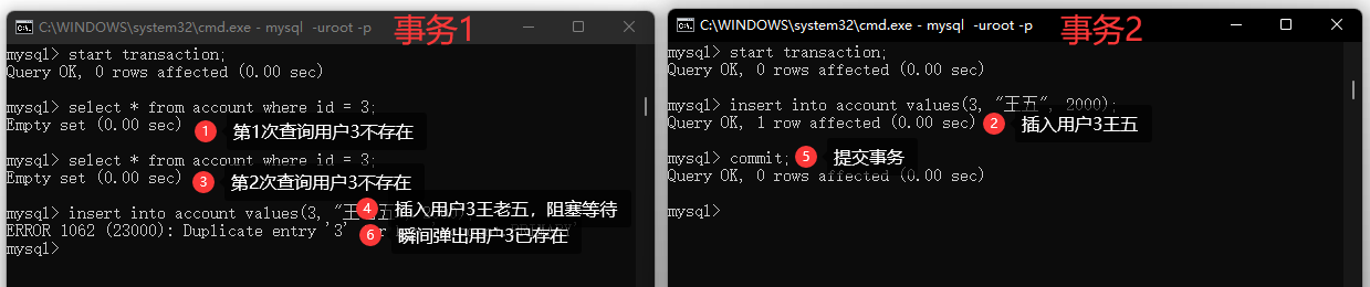 我们继续往下执行,在事务1内,既然3不存在那我就插入,插入提示已存在,再查还是查不到用户3