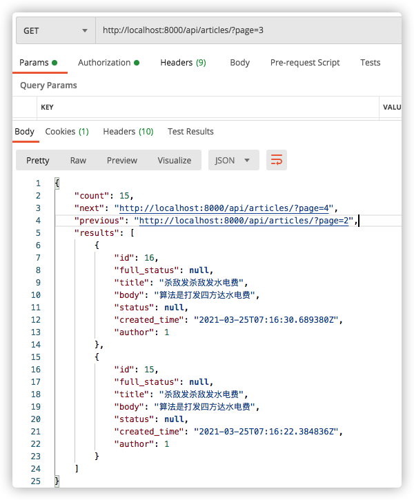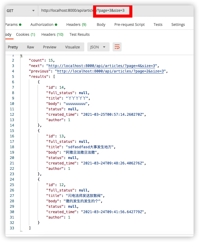 我们自定义了一个MyPageNumberPagination类,该类继承了PageNumberPagination类。我们通过page_size设置了每页默认展示数据的条数,通过page_size_query_param设置了每页size的参数名以及通过max_page_size设置了每个可以展示的最大数据条数。