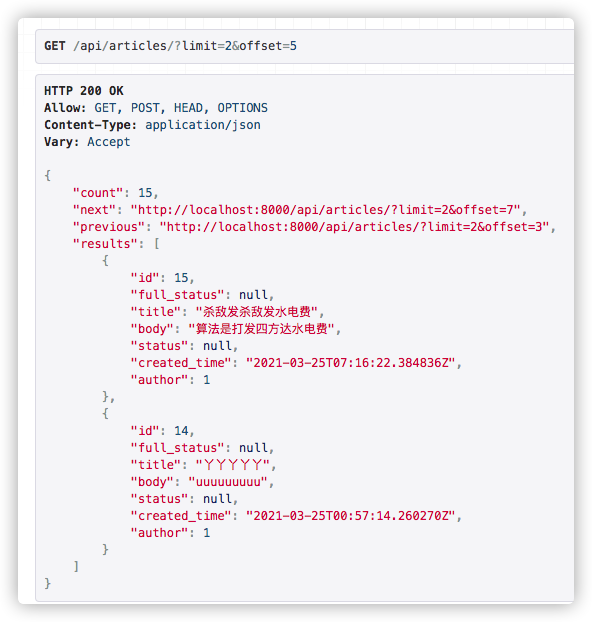 我们自定义了一个MyLimitOffsetPagination类,该类继承了LimitOffsetPagination类。我们通过default_limit设置了每页默认展示数据的条数,通过limit_query_param设置了每页size的参数名以及通过max_limit设置了每个可以展示的最大数据条数。