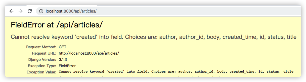 为什么会出错误? 使用CursorPagination类需要你的模型里有created这个字段,否则你需要手动指定ordering字段。这是因为CursorPagination类只能对排过序的查询集进行分页展示。我们的Article模型只有create_date字段,没有created这个字段,所以会报错。