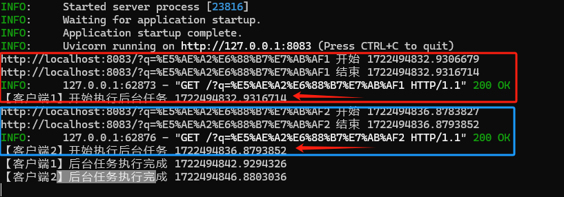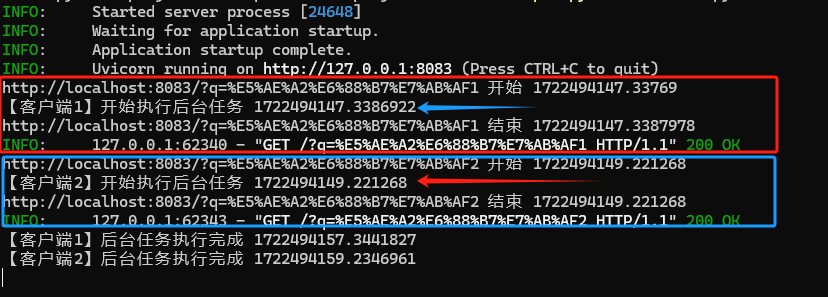async def background_task(name:str, duration: int = 3): print(f"【{name}】开始执行后台任务", time.time()) await asyncio.sleep(duration) print(f'【{name}】后台任务执行完成', time.time())