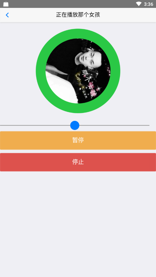 我们简单做了一点特效,播放时音乐旋转,如同cd一样,slide播放进度暂未实现哟,暂停/继续、停止/开始按钮切换