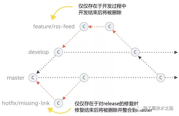 分支命名: hotfix/ 开头的为修复分支,它的命名规则与feature分支类似。线上出现紧急问题时,需要及时修复,以master分支为基线,创建hotfix分支,修复完成后,需要合并到master分支和develop分支