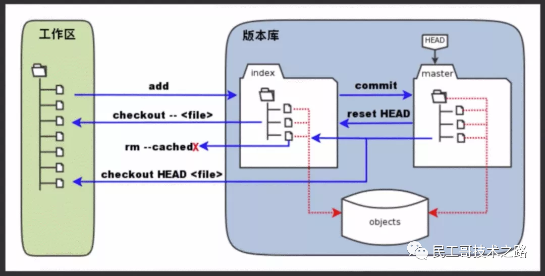 - 暂存区(staging)- 暂存区是一个文件,保存了下次将提交的文件列表信息,一般在 Git 仓库目录中。有时候也被称作 `‘索引’’,不过一般说法还是叫暂存区。