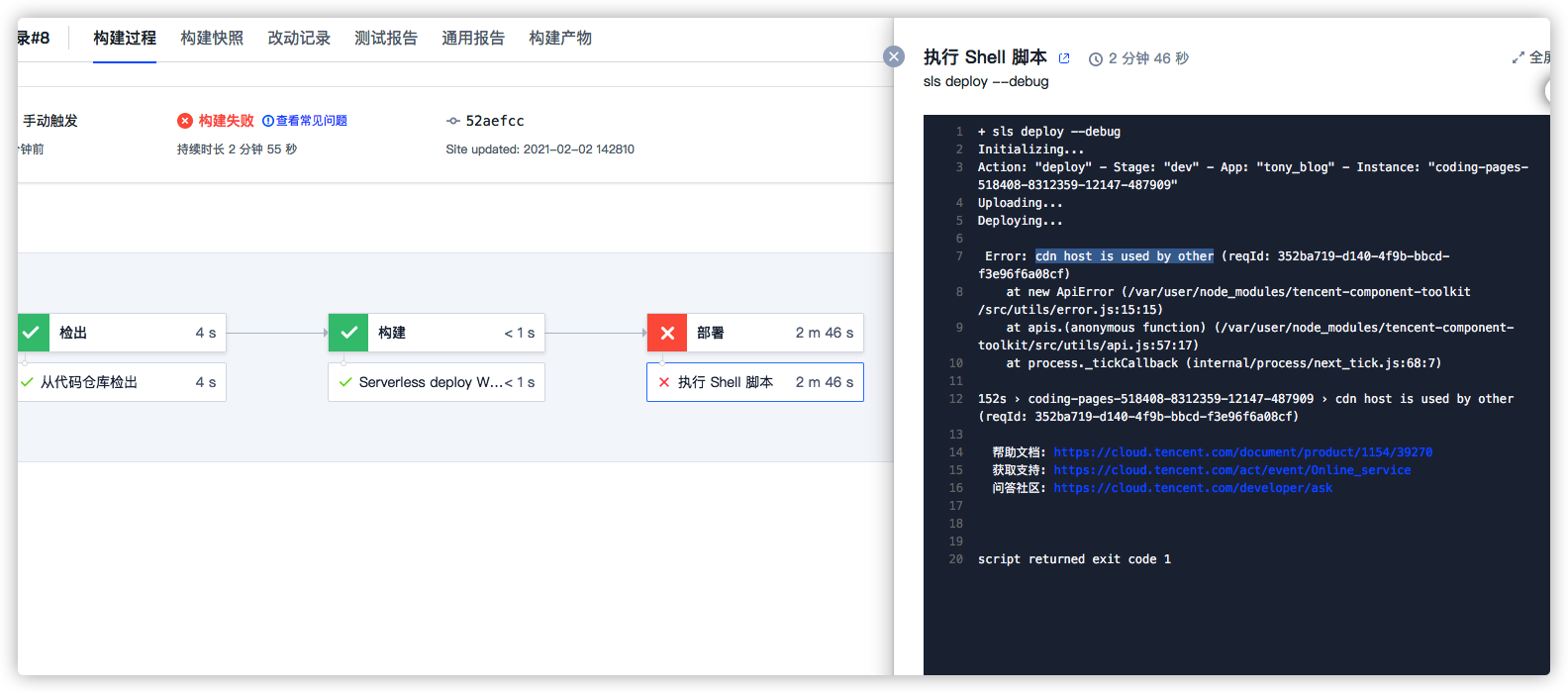 解绑后马上绑定了我的另外一个腾讯云账户,正常的部署,一切看似正常,问题却出在了绑定自定义域名上。给出的错误提示为: Error: cdn host is used by other。