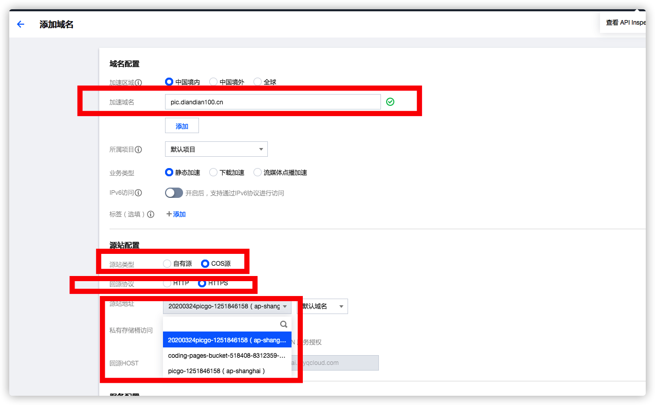 主要填写的地方我都圈了下,选择cos源,源站地址选择你的cos就可以了,保存。