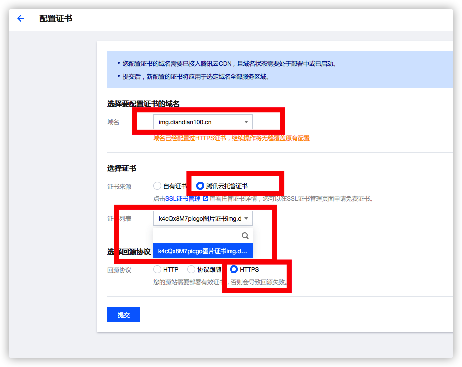 进入证书管理页面https://console.cloud.tencent.com/cdn/certificate,点击配置证书。如下图所示选择你的域名和对应的证书提交即可