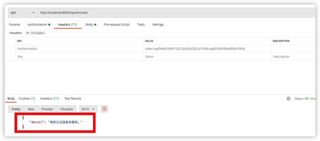 或者使用postman测试 ,首先你要确保要测试的视图权限(permission_classes)是IsAuthenticated,只有验证用户才可访问。