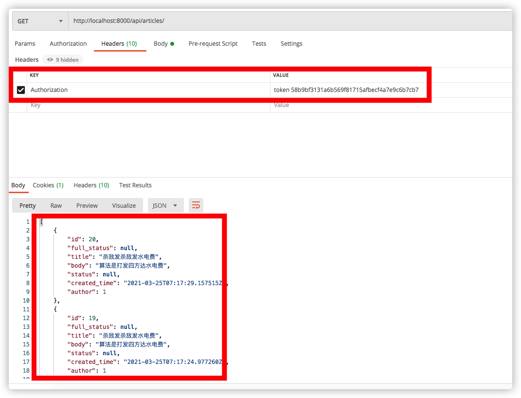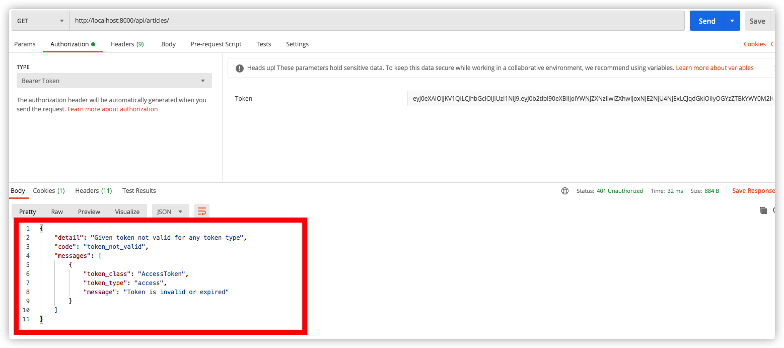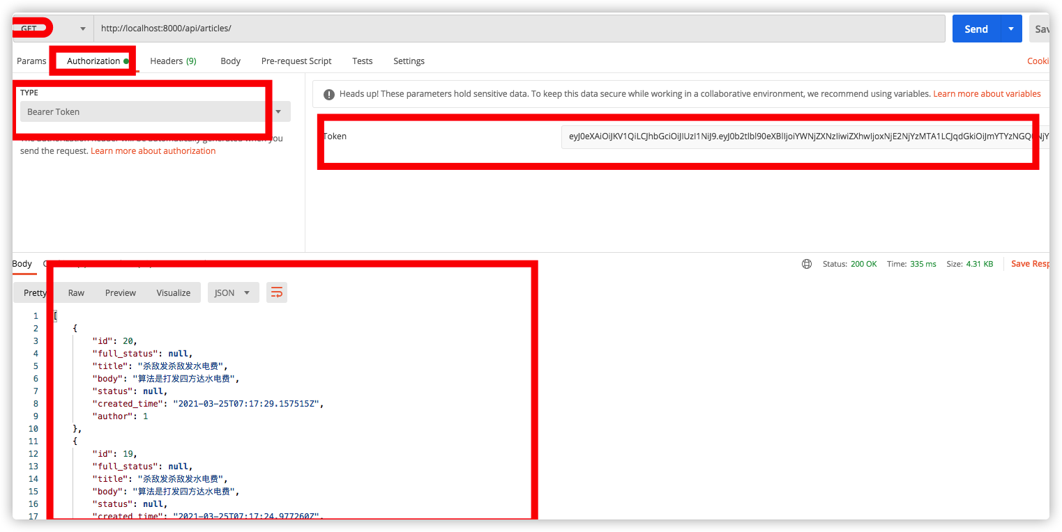 假如你有一个受保护的视图(比如这里的/articles/),权限(permission_classes)是IsAuthenticated,只有验证用户才可访问。访问这个保护视图时你只需要在请求头的Authorization选项里输入你刚才获取的access token即可,如下所示: