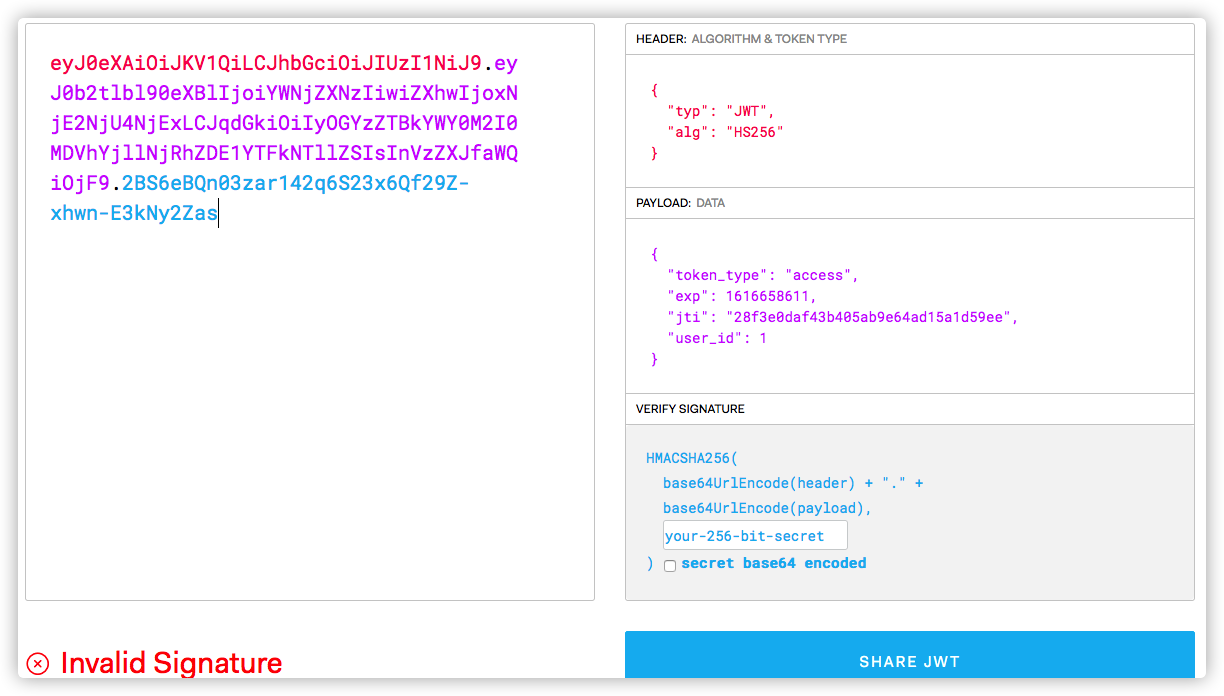 如果你对Simple JWT返回的access token进行解码,你会发现这个token的payload数据部分包括token类型,token失效时间,jti(一个类似随机字符串)和user_id。如果你希望在payload部分提供更多信息,比如用户的username,email等,这时你就要自定义令牌(token)了。
