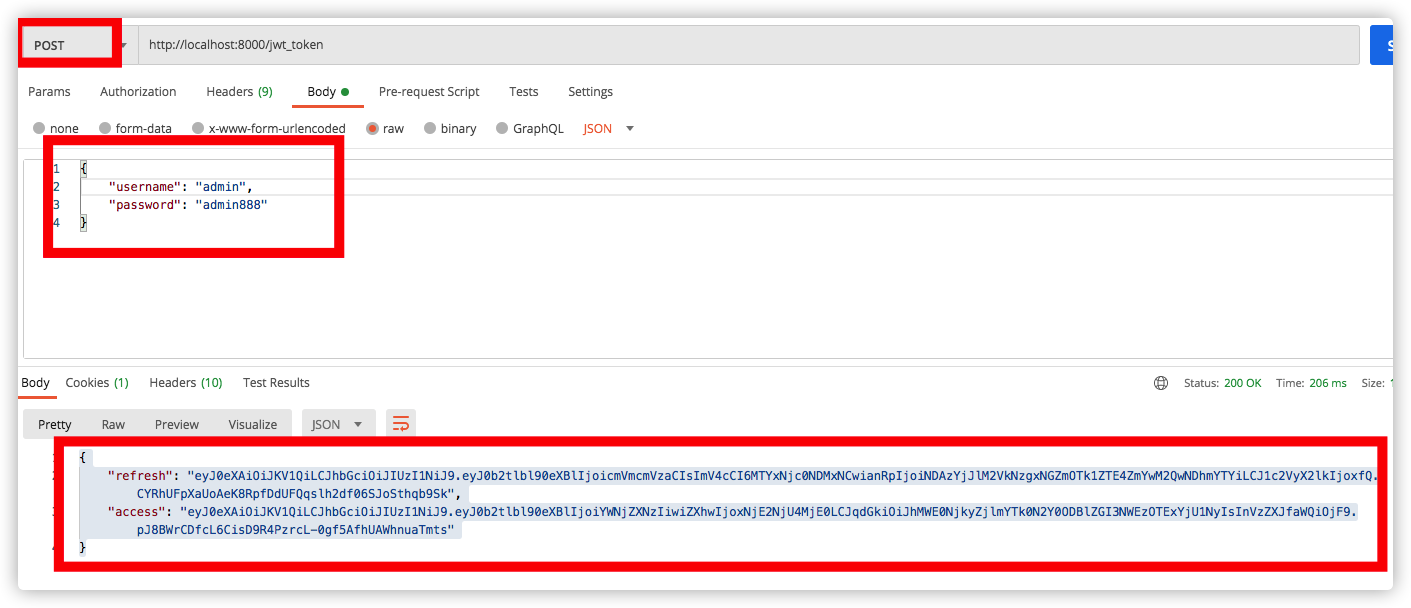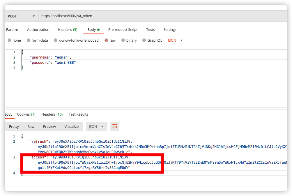 现在我们可以开始使用postman测试了。通过POST方法发送登录请求到/token/, 请求数据包括username和password。如果登录成功,你将得到两个长字符串,一个是access token(访问令牌),还有一个是refresh token(刷新令牌),如下所示: