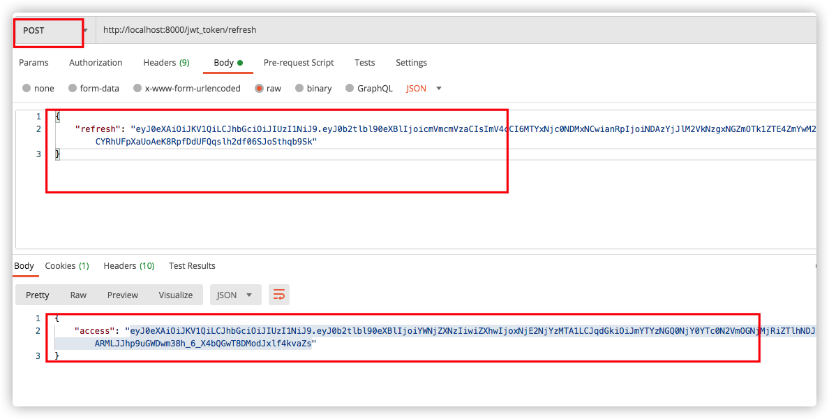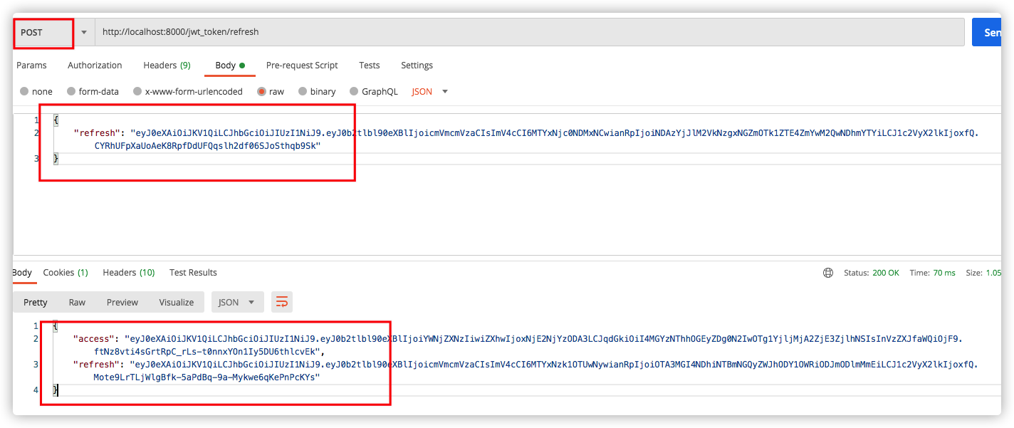 去获取新的access token,你需要使用之前获得的refresh token。你将这个refresh token放到请求的正文(body)里,发送POST请求到/jwt_token/refresh/即可获得刷新后的access token(访问令牌), 如下所示:
