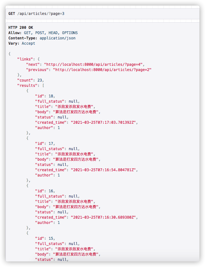 当你发送GET请求到/api/articles?page=3时可以得到下面返回的分页数据列表。现在我们希望对结果进行进一步过滤,比如返回标题含有关键词”华为”的文章资源列表。我们到底该怎么做呢? 本例中演示三种过滤方法, 你可以根据实际项目开发需求去使用。