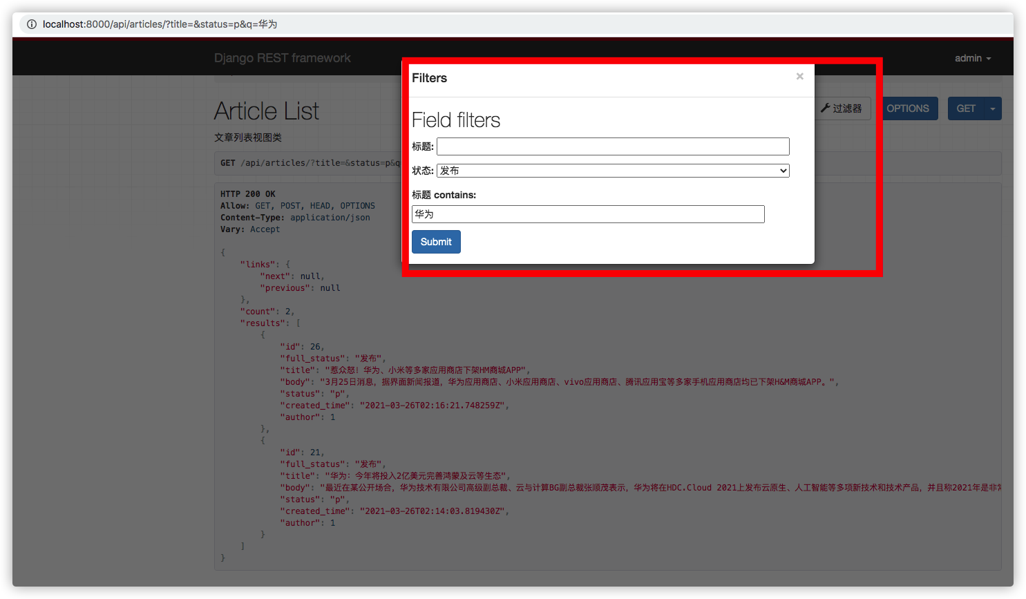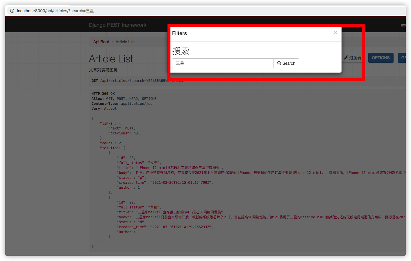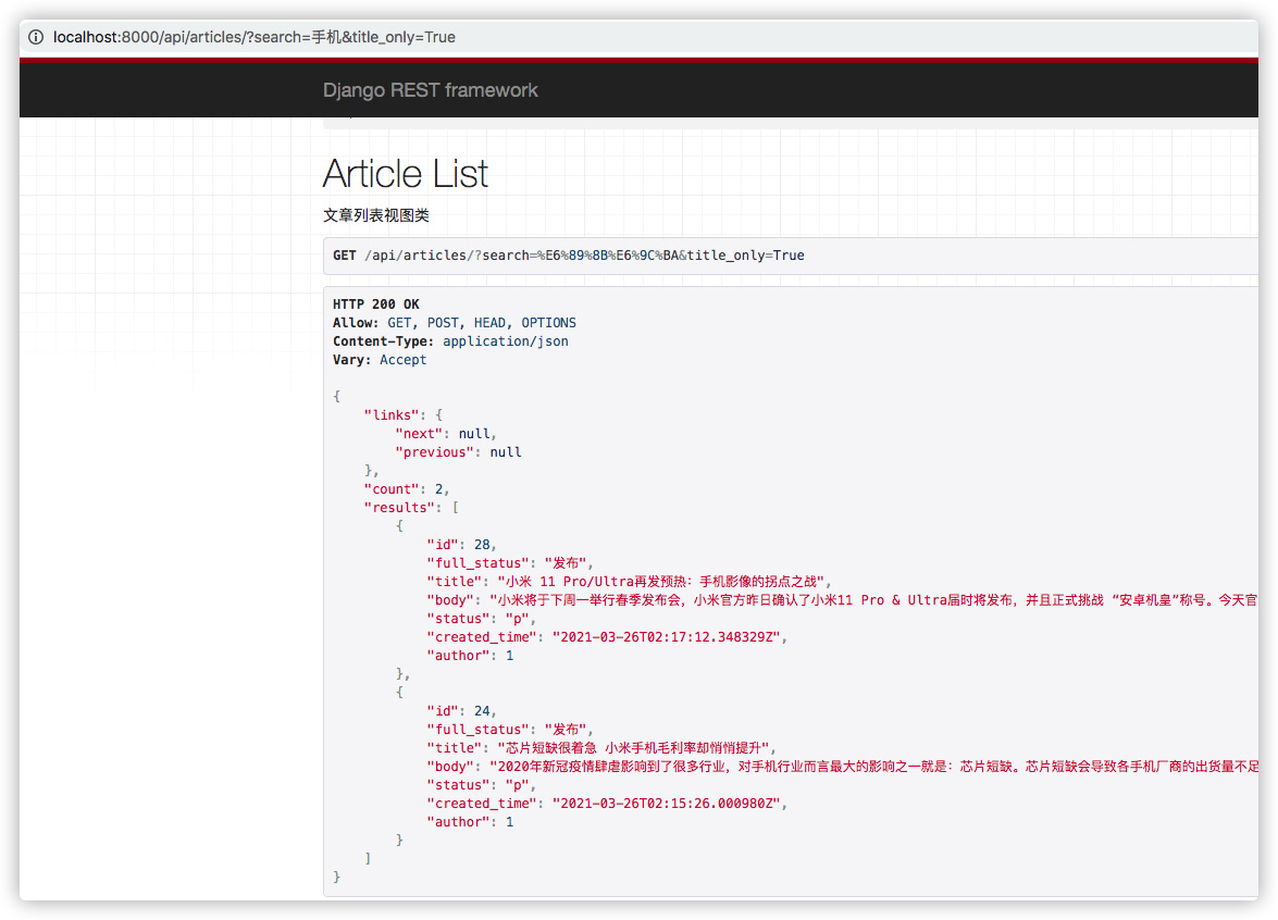 修改好视图类后,发送GET请求到/api/articles/?q=华为, 你将得到所有标题含有华为关键词的文章列表,这里显示一共有3条结果。