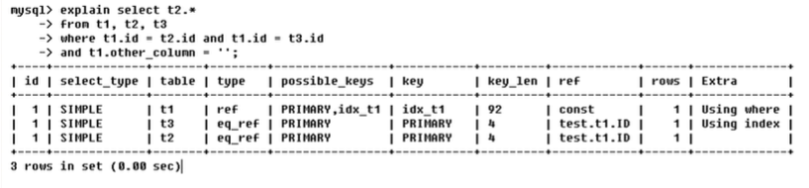 eq_ref : 唯一性索引扫描,对于每个索引建,表中只有一条记录与之匹配,常见于主键或唯一索引的扫描