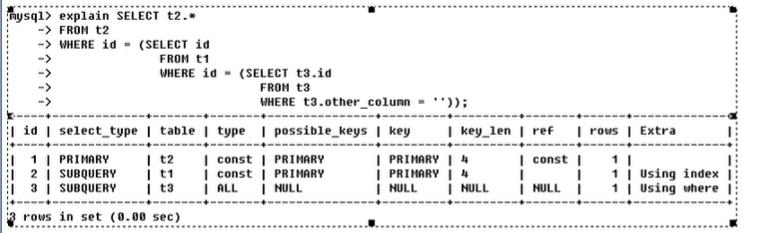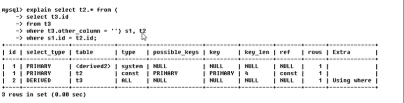 如果是子查询,id的序号会递增,id值越大优先级越高,越被执行。所以上例id=3先被执行,type=ALL做的是一个全表扫描