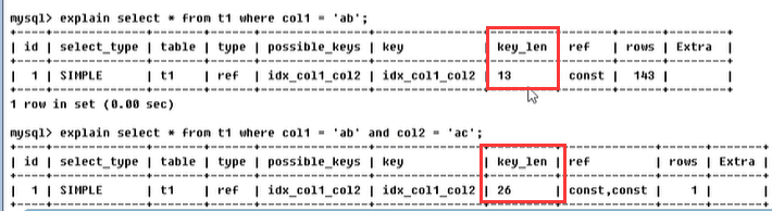 同样查询结果,精度越小,key_len越小,查询效果越好。
