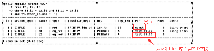 显示索引的哪一列被使用了,如果可能的话,是一个常量,哪些列被用于查找索引列上的值。