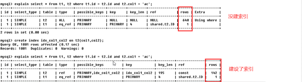 如图,可以看到建立索引和没有建立索引所扫描行数区别。