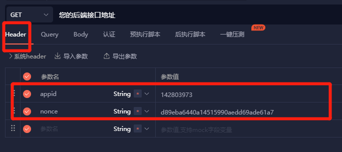 先添加两个固定参数,timestamp和signature会通过预执行脚本动态添加到header