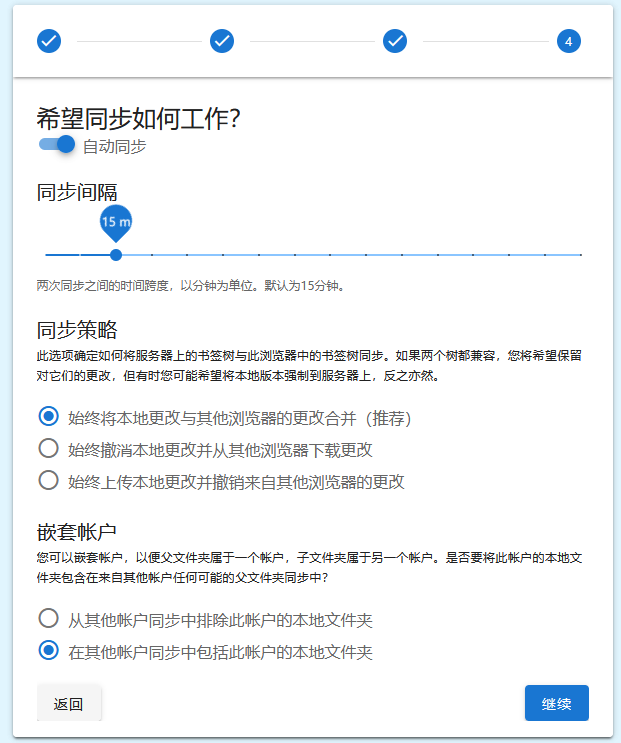 嵌套账户:如果你的书签中存在文件夹目录,需要选择下图中这个选项,不然在同步的时候会混乱,创建很多重复的空的文件夹。