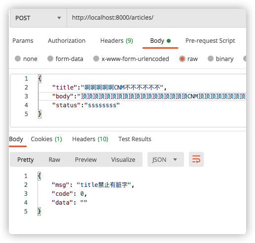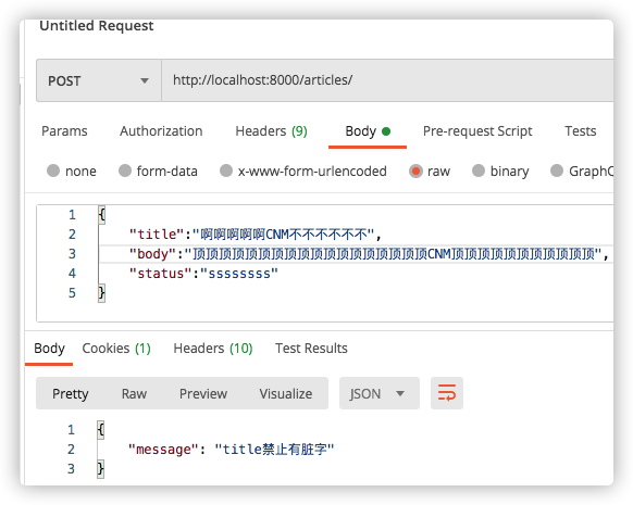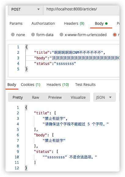 验证错误的处理方式稍有不同,但都是将字段名称作为响应中的关键字。如果验证错误不是特定于某个字段的,那么它将使用 “non_field_errors” 键,或者为 NON_FIELD_ERRORS_KEY setting 设置的字符串值。