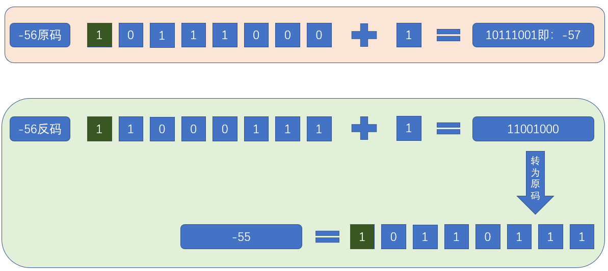 我们采用-56反码进行计算,结果再转为原码,结果得出-55,这才乖嘛。