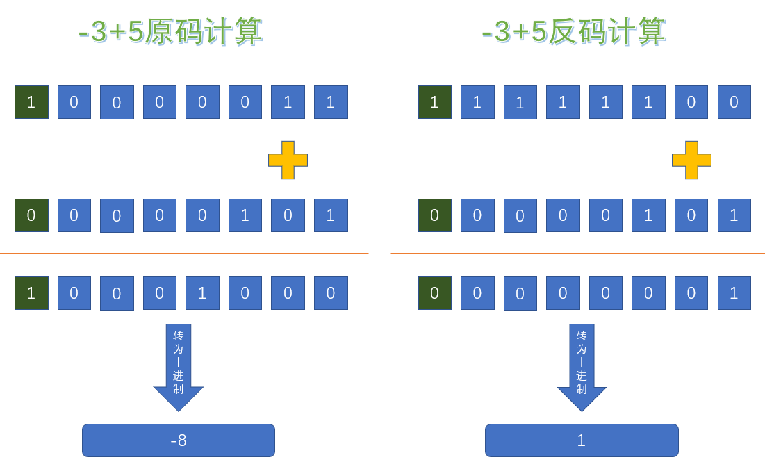上述示例来看,使用反码只要是跨0的计算,结果都跟正确结果差了1,这就是反码计算时0的两种表现形式导致的,为了解决这个问题,当当当当,补码出现了。