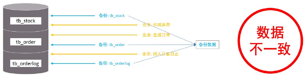 此时备份出来的数据,是存在问题的。因为备份出来的数据,tb_stock表与tb_order表的数据不一致(有最新操作的订单信息,但是库存数没减)。